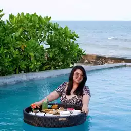 For those who like content, we recommend Afternoon Tea, Floating style. You can take photos on the pool with a sea view. It's very beautiful. You'll definitely get lots of photos.