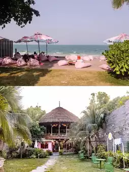 There is also a beachfront cafe of the hotel called Top Seacret, a Bali-style beachfront cafe decorated in cute pink tones. You can come and sit and sip a drink and chill, especially in the evening, the atmosphere is great. The beautiful sea is near Khao Takiab, you can see it.