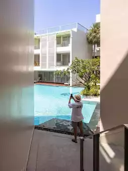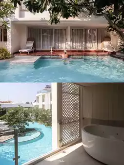 The highlight of this place is the minimalist white building next to the swimming pool. There are both Pool Side rooms on the 1st floor, you can walk down to the pool from the room.