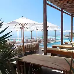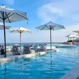 ⚓️ Sundance Dayclub is a luxurious beach club by the sea in Hua Hin that gives off a Santorini-like atmosphere with white and blue tones contrasting with the beige furniture and beach umbrellas. There are plenty of beautiful photo spots, whether by the 40-meter infinity pool or on a relaxing sofa by the beach. There are 2 seating areas to choose from: SUNRISE, which serves spicy Thai seafood, and SUNSET, which offers a variety of fusion food and drinks, while watching the romantic sunset.