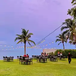 #Share a travel plan Baan Dum, a restaurant by the sea in Hua Hin, good atmosphere, green grass, seating area both under the house and next to the sea view. In the evening, I must say that the weather is very good. Here, there is both spicy Thai food, Southern food, seafood, or even European food. Some days, there is live music to listen to beautiful music. Sit and eat while listening to music. It's great for anyone who comes to visit Hua Hin and wants to experience this kind of atmosphere. I recommend this place. #Recommended restaurant