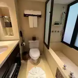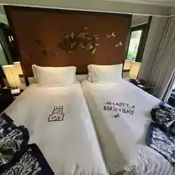 Accommodation at Anantara Hua Hin Resort Hotel, by the sea, the air is Lanna style (staff said), peaceful, you can relax, there is a large swimming pool with multiple levels of depth, a 24-hour fitness center, a tennis court, a varied and delicious breakfast, a soft and comfortable bed, I asked for a complimentary birthday cake, it was very cute, the service was good, I was impressed, if I have the chance I will choose to stay here again, there is a welcome drink of lemongrass juice, sweet and fragrant #Hua Hin #Hua Hin accommodation