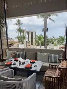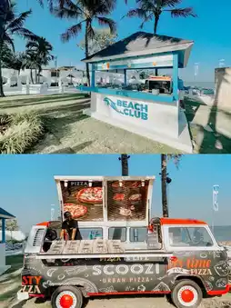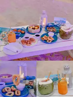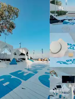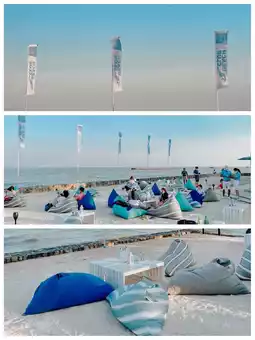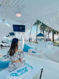 • Decorated in soothing white and blue 💙🤍 There are both beach chairs and soft cushions on the sand. 🏖