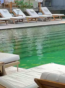 The hotel has its own beach, equipped with lounge chairs and a large swimming pool
