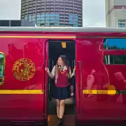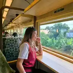 The Royal Blossom train is very beautiful. The top of the train is divided into 5 cars. We sat in the 4th car. The seats are comfortable. There are plugs to charge your battery. Food, snacks, and drinks are served during the journey.
