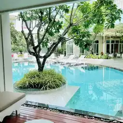 The rooms are adjacent to the pool, you can walk straight into the pool from the door. The atmosphere is very nice and refreshing. The area is spacious.