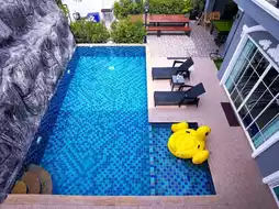 Numnueng Pool Villa is one of the top accommodations where you can make noise 24/7. If you're a party person with many friends, we highly recommend this place. The villa is quite secluded and offers a lot of privacy as each house is fenced. The relaxation amenities are fully equipped, including electric massage chairs, Bluetooth sound systems, karaoke via Smart TV, BBQ grills, and pool tables. If you're looking for a house where you can have a BBQ, this place is perfect as it is not far from the fresh market and shopping malls.