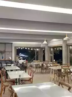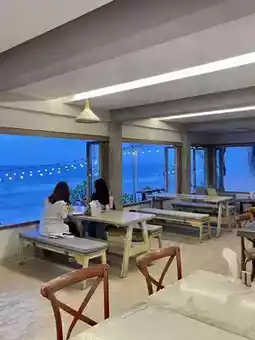 The hotel's restaurant and cafe area is simply but stylishly decorated 🪟 and serves quality orders. Especially if you come in the evening, the sea will add even more charm to your meal.