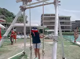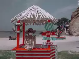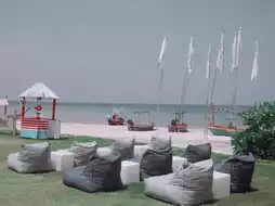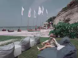 Skoop Beach Cafe Hua Hin is a charming cafe that offers delicious ice cream. The cafe is located within the Verso Hotel Hua Hin. The interior is compact with limited seating but feels spacious due to large glass windows offering views outside. The decor features blue and white tones. The exterior atmosphere is perfect for a relaxed evening with options to sit by the beautiful pool area with views of the stylish hotel building or choose a beach view that stretches as far as the eye can see with Khao Takiab mountain on the side. The cafe also has beach decorations and several beautiful photo spots.