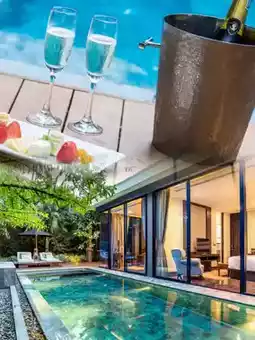 V Villas is hidden in lush gardens, offering a sense of privacy. The modern Thai-style architecture blends perfectly with nature. The outdoor private pool glistens in the sun, surrounded by flowers. Lie on a deck chair and let the sea breeze blow away all your worries.