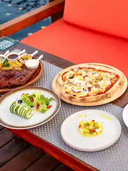 It is a restaurant by the pool with a sea view. The view is definitely beautiful.