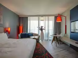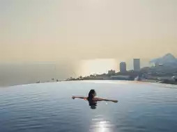 🏢 The hotel is located in the heart of Hua Hin, near tourist attractions. It is a large luxury hotel with complete facilities. There is a panoramic pool, spa, fitness center, restaurant, rooftop bar, cafe, and most importantly, they have a very large water park with amazing rides.