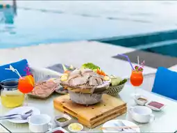 Inside the hotel, there was a corner to sit and take pictures. The highlight was the swimming pool by the sea. You could walk down to it. The sea water was very clear. You could see the view of Khao Takiab in the distance. There was a service for a barbecue set by the pool and Thai food. Sit and eat while watching the sea view.