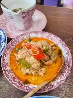 Mata Pita Canteen is located on Naeb Kehardt Road, Hua Hin Soi 51. The restaurant stands out with its striking purple color. Inside, the decor is beautiful. The menu focuses on Thai-style curry rice and also offers desserts, all served in uniquely beautiful dishes. We came here for breakfast with the family and chose a variety of dishes. Prices start at 40 baht, and the portions are not very large, so you can order several dishes to try different things. Our favorites were the pork toast, stir-fried chives with liver, and green curry. Overall, everything was delicious. The owner, who is very friendly and pleasant to talk to, made the experience even better. We will definitely come back again.