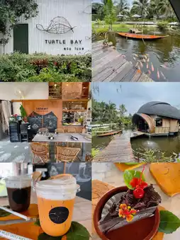 Turtle Bay — A cafe and restaurant in a turtle-shaped resort. The cafe is located in the middle of a small river. The atmosphere is shady. There are menus of food and desserts, beautifully decorated drinks, and plenty of photo spots.