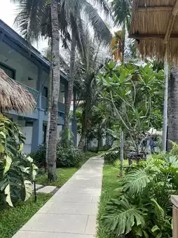 • Unique Design: Mediterranean and Balinese-inspired decor with a blue-and-white theme, surrounded by lush greenery, giving the feel of a vacation home.