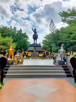 This temple is home to the world's largest statue of Luang Pu Thuat, standing majestically at the center of the temple. Inside, there are incense, candles, and flowers available for worship at the designated spots on both sides. Visitors can make merit according to their faith. Upon ascending to the upper area, you can walk around the statue of Luang Pu Thuat, apply gold leaf, and ring the bell to enhance your good fortune. Surrounding the lower area, there are statues of Thao Wessuwan and Ai Khai where you can pray for luck and blessings. The atmosphere is peaceful, with ample parking space. Follow the directions to visit! 📍Highway No. 3219, Thap Tai Subdistrict, Hua Hin District, Prachuap Khiri Khan 77110.
