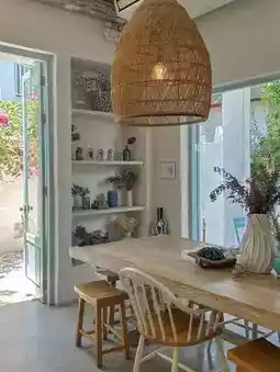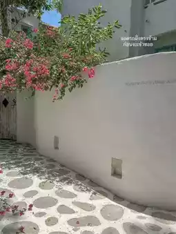 The design blends Mediterranean–Greek vibes with a touch of tropical coziness. Whitewashed walls, turquoise doors, and blooming bougainvillea create a seaside escape feeling. Inside, the café is decorated with natural wood tables, rattan lamps, and ceramic accents, making it perfect for slow mornings or afternoon coffee. The resort facilities include cozy rooms, an on-site café, and nearby beach access.