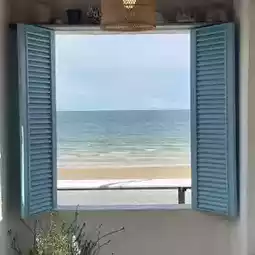 A beachside cafe with brightly decorated decor.