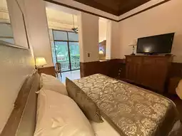 Inside the room, there were two oranges as complimentary fruit, four bottles of water, a TV, a refrigerator, a work desk, a sofa, and a dining corner. Additionally, there was a balcony that allowed access to the garden and nearby swimming pool from the back of the room.
