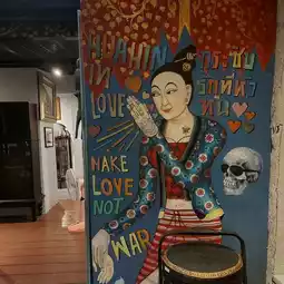 This exhibition, located at Baan Silpin, Hua Hin, is a tribute to the world-famous Whispering Love legend at Wat Phumin in Nan Province. The exhibition is located in the Hua Hin Remembrance Zone, showcasing Lanna art. It features a mural depicting a couple whispering their love to each other. It's so adorable! We should try to whisper our love to each other!