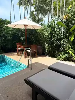 For those who love the touch of nature, this place will surely delight you. Waking up to the sound of birds and the morning sunlight is truly refreshing. We stayed in a Private Pool Villa, a 150-square-meter villa with a private pool. The room was spacious and not far from the beach, offering great privacy. The interior was well-designed, featuring a living room with a cozy sofa where you can watch TV or enjoy the surrounding views. The bathroom was large, with a big bathtub for soaking and an outdoor shower. Outside, there was a small pool with a seating area, perfect for relaxation. The atmosphere was quiet and very tranquil. The bedroom had a soft king-size bed, ideal for two guests. The room was fully equipped with amenities, ensuring a comfortable stay. You could even step out directly to the pool for a relaxing swim. The privacy here is exceptional.