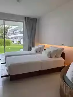 #VisitHuaHin: A luxurious beachfront resort emphasizing simplicity in a modern, minimalist style. Each room is designed to be airy and spacious, featuring soothing white tones, creating a sense of tranquility and relaxation. The resort also features an outdoor pool surrounded by tall trees, offering exceptional privacy. A highlight is the pool villas, which open directly into the pool. This accommodation is perfect for couples seeking private time, or families seeking a quiet, beachfront retreat where they can enjoy a leisurely morning stroll.
