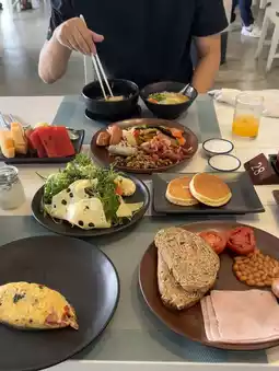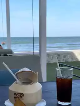 The next day, we took a taxi into Hua Hin town and headed straight to the world-famous srna coffee shop. The black coffee is delicious, but it's only available for takeout. We continued down the road until we reached the world-renowned Oceanside Restaurant. At first, we just wanted to see if it was as beautiful as everyone said. But once inside, we were immediately seated... We didn't hesitate for a second. We sat down, asked for a menu, ordered drinks, and paid for the view. The restaurant is right on the beach, with fine white sand at your feet and the waves rolling in front of us. They even took advantage of the location by installing a large mirror on the right wall, reflecting the ocean, creating the illusion of a 180-degree view. 🥲🥹😇 It was truly heaven...!! We sat facing the ocean for a long time, watching the waves crash against the shore. The boat drifted closer and further away on the water. A large fan whirled overhead, bringing a gentle breeze. The whispers of my neighbors became white noise, and my thoughts drifted away. I can't remember what I was thinking now, but I can tell you that the beauty of the clear sky and the sea had a cleansing and soothing power.