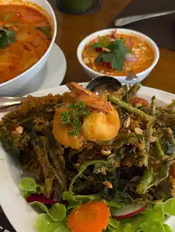 I highly recommend afternoon tea here. Personally, I wasn't too fond of the menu. I ordered two recommended dishes: river prawn fried rice and fried shrimp spinach salad, both of which were average. The tom yum goong, which I thought would be amazing, was a bit salty and greasy. Overall, I was quite disappointed with the food. (The wall says the restaurant received Michelin awards in both 2020 and 2021, which means the food may not be as delicious as it used to be.)