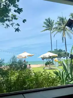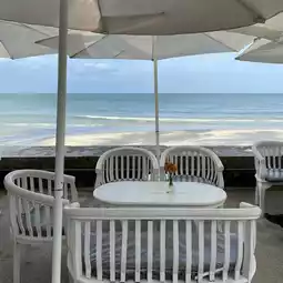 This restaurant is right on the beach, with both air-conditioned and outdoor seating. The outdoor seating might not be well-maintained, some of the cushions are worn, but it's still comfortable. Overall, it's okay, the price is reasonable, the atmosphere is good, and there are plenty of photo spots. There's plenty of parking!