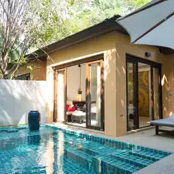 🛖🛏️ We stayed in a 1 Bedroom Private Pool Villa, a private villa. The room has a bedroom, living room, and a bathroom that are clearly separated. It is very spacious. There is also an outdoor area with a private swimming pool and large, shady trees.