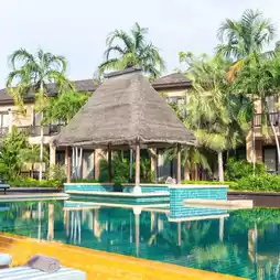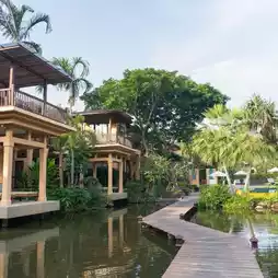 The resort is decorated in a modern tropical style. It is luxurious, quiet, and very private. The atmosphere is shady with large trees throughout the resort. ✨🌳 It is suitable for relaxation without having to go anywhere because the resort has a spa, fitness center, large swimming pool, and restaurant, all in one place.