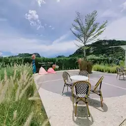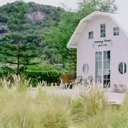 The cafe itself is super cute!!! It's a warm, gentle white barn style, hidden amidst a romantic field of flowers and a beautiful view of Khao Tao Reservoir ❤ #There are many photo spots and every corner is awesome, whether it's a picnic spot, a sweet flower ring, a swing in the grass, a cool barn background, and many other corners! 📸
