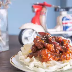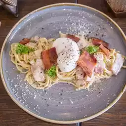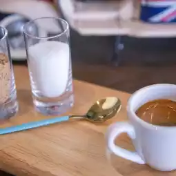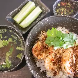 After ordering food, a welcome drink will be served. The food here is in East meat West style, both Thai and foreign. Every dish is rich and spicy. There is spaghetti carbonara with onsen egg, French fries, BBQ chicken wings, fried shrimp with chili and salt, 4 large shrimps, a full bowl of rice, and crab curry with cha-kram leaves + rice vermicelli, which is the shop's signature menu. The chili paste is homemade, very delicious, no kidding. Full of crab meat, in chunks. I must say that this menu is a must-try. The dessert is a young coconut croissant, delicious, slightly sweet, filling. Finish with a hot espresso. The coffee is very fragrant. They use a blend of coffee beans from Huai Nam Khun, Chiang Rai and San Antonio, Brazil.