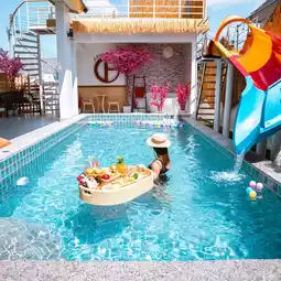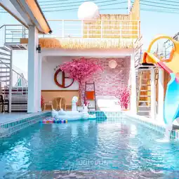 Today, Mae brought me to see this: 93 S.udomsap Pool Villa, Cha-am. It is a 3-bedroom, 3-bathroom house with a saltwater pool💦 and a water slide 🛝. It can accommodate 10 people and costs less than five hundred! It's great!!