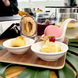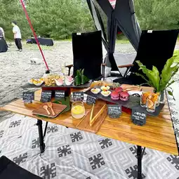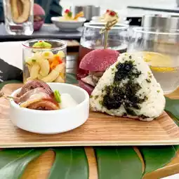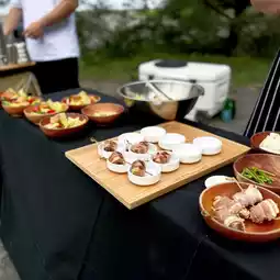 The colorful savory snacks include grilled chicken with shallots and purple potato burgers, mackerel, matsutake mushrooms, bacon skewers with tender mountain basil, seafood rice balls, lemon scallop and shrimp salad, and two-color mango and fresh vegetable noodle salad. The package includes wraps, rice, and noodles, which will definitely fill everyone up.