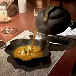 At this moment, a hot soup is served, which is made of wild lobster from the East Coast, mussels from Xunhua, Qixingtan, and organic tomatoes from Xibao. What does this rich combination taste like?