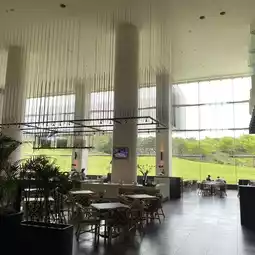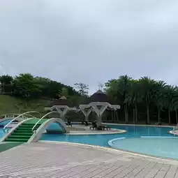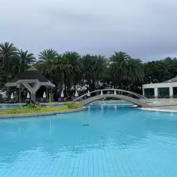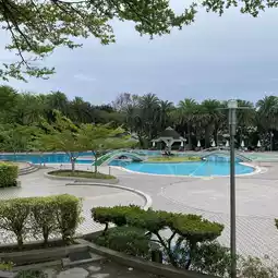 There is a restaurant with large floor-to-ceiling windows and a super large swimming pool! !
