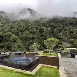 I really like the swimming pool on the rooftop surrounded by mountains and mist.