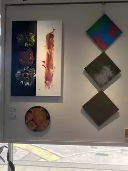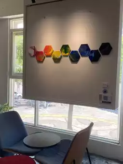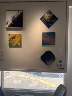 The window is full of colorful paintings