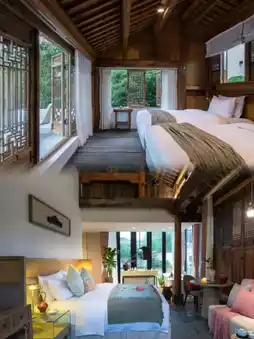 - View: The hotel is surrounded by a maple forest 🌳, next to the inland river flowing 💧, extremely secretive and quiet, is the better view of the south of Xixi 🌄. Walking out of the hotel, you will find the ancient village of Xixinan, with the old house pavilion, the green pavilion and more than 100 ancient buildings from the Ming and Qing Dynasties🏛️, as well as the thousand-year-old ginkgo tree, the century-old osmanthus tree, the rohan tree, etc.