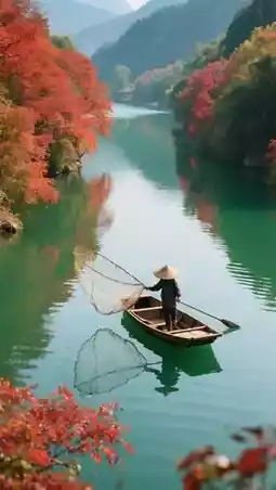 - Scene: mirror-like river, red leaves reflected on both banks, fishing boats singing at dusk