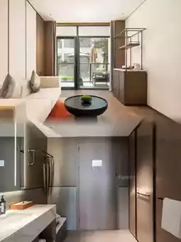 In the morning, opening the full-length terrace doors reveals elegant arcs of egrets skimming across the water's surface. The interiors use breathable linen fabrics and locally crafted camphor wood furniture, with custom fragrances inspired by lakeside reeds. Smart systems are seamlessly integrated into rustic textures, while the copper bathtub in the bathroom pays homage to Huangshi's ancient bronze culture.