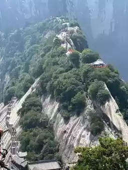 [Grin] "After visiting Mount Hua, you will never want to look at any other mountain." Mount Hua is made of a single piece of granite and has five main peaks, namely the East, South, West, North, and Central peaks. Qin Shihuang, Emperor Wu of Han, and Empress Wu Zetian all held ceremonies to worship heaven here.