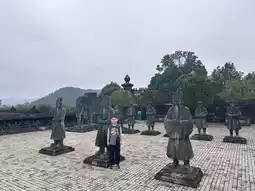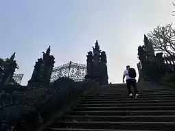 Climbing the stone steps, you’re greeted by stone statues of guards and mandarins, lined up in quiet formation. Inside, the real treasure awaits: the intricately decorated main hall, where walls and ceilings are covered in vibrant glass and porcelain mosaics. The detail is stunning, especially the ornate ceiling above the emperor’s tomb.