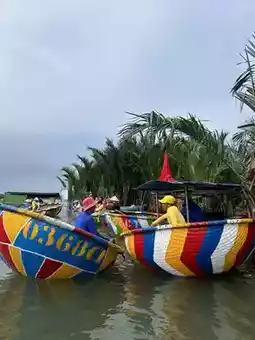The journey follows the Thu Bon River**, through rice fields and coconut groves.