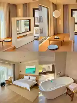 7⃣️The bed is very soft and comfortable, and you don't want to get up when you lie down. The curtains and lights are all intelligent voice-controlled. The air conditioner was turned on in advance before check-in, and it was very warm! The bathroom is dry and wet separated, with an intelligent toilet, and a large bathtub. It's so cool to take a bath.