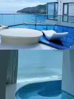 It consists of two adjacent sea-view villas, with a pure white exterior and numerous square architectural lines. The floor-to-ceiling windows seamlessly connect the magnificent outdoor sea view with the indoor accommodation experience. Red, gray, and black bricks are arranged neatly yet staggered, creating a strong sense of spatial layering. In the courtyard, the pure white arched gate, crescent-shaped swing, and elegantly designed swimming pool, all facing the azure sea, exude a romantic and poetic atmosphere.