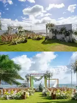 1️⃣ 270° unobstructed sea view lawn, full of ceremony atmosphere. Standing on the lawn, behind you is the glassy sea and coconut trees, underfoot is soft white sand, and when the sea breeze blows, your veil and dress flutter together. The best part — the entire beach is just for you and your guests, no need to compete with tourists for the perfect spot, absolute privacy!