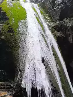 Finally, I came to Bailong Pool and Bailong Waterfall. The waterfall has a drop of over a hundred meters, with a deafening sound, and the pool is so deep that its bottom cannot be seen. Standing beside a huge rock, I felt the grandeur and power of nature. Then, I followed the mountain road towards Haohan Slope to descend the mountain, ending this unforgettable journey to Guanshan.